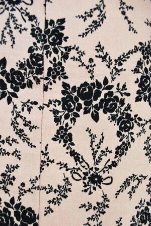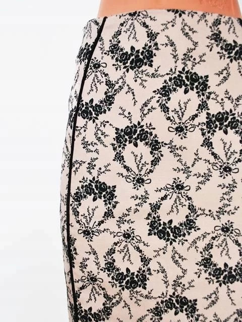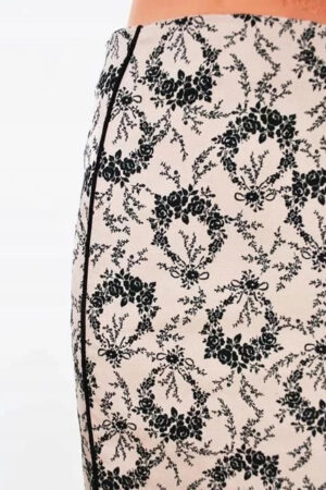 Elegancka, ołówkowa spódnica. Zdobiona kwiecistym wzorem. W odcieniach beżu i czerni. Na podszewce. Zapinana na zamek z tyłu. Z podszewką. Z tyłu rozcięcie.