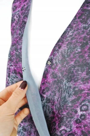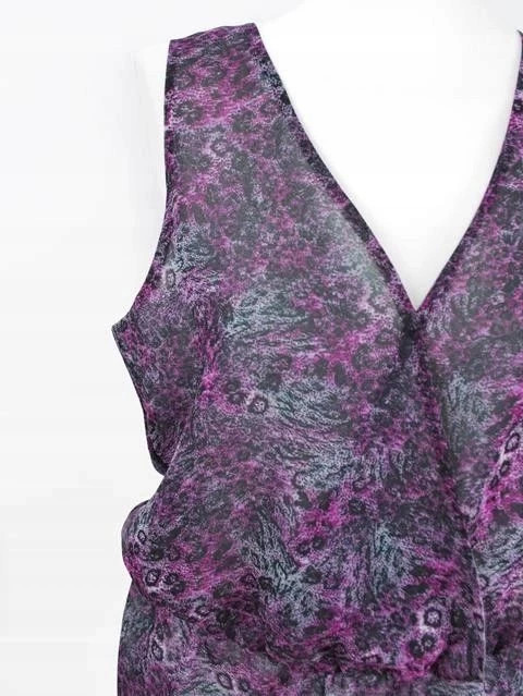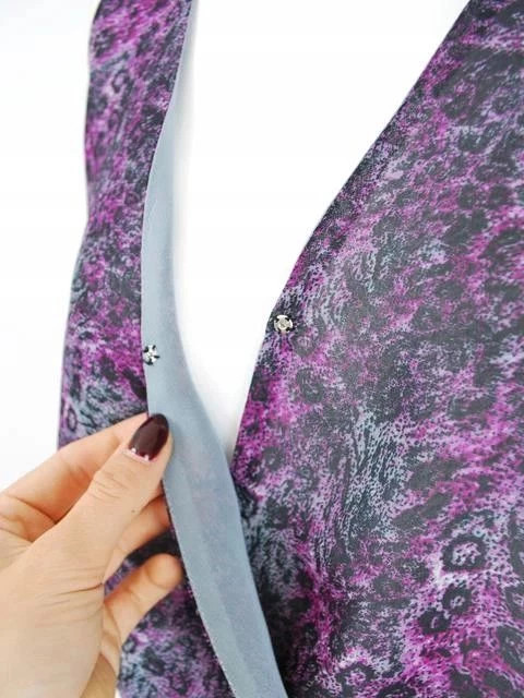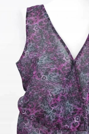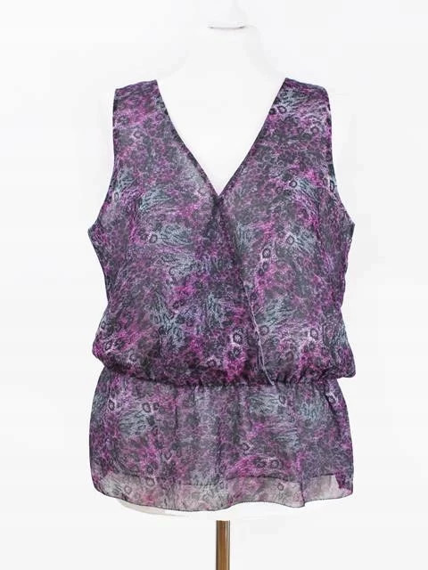 Elegancka bluzka bez rękawów. Kopertowy, zakładany dekolt, zapinany na zatrzask. W kolorach czerni i fioletu. Szyfonowa, na podszewce, nie prześwituje. Odcinana w talii gumką. Luźny fason.