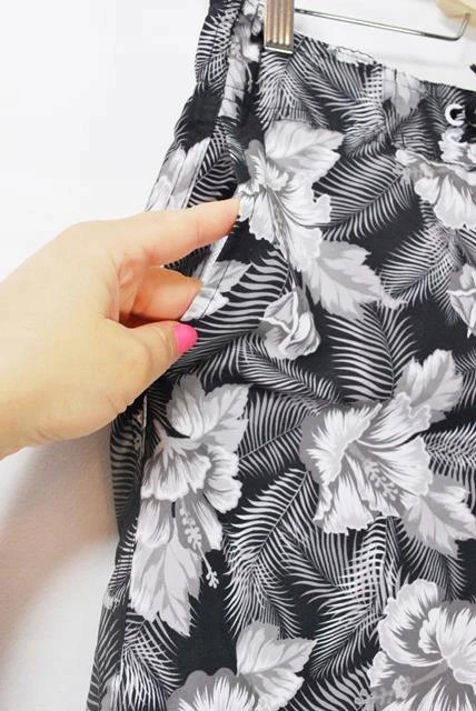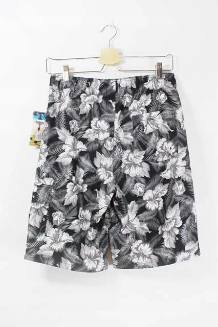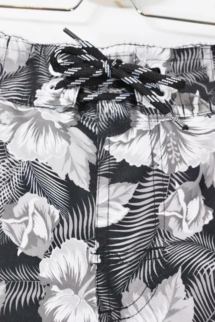 Spodenki plażowe z wewnętrzną siateczką. Czarno-szare kwiaty. Wiązane w pasie sznurkiem, gumka w tylnej części pasa. Kieszenie.