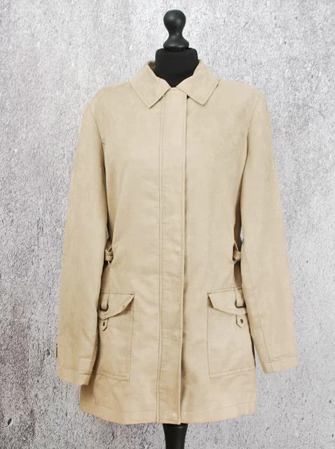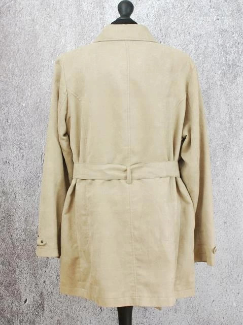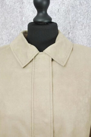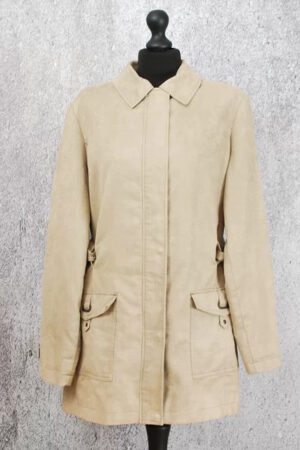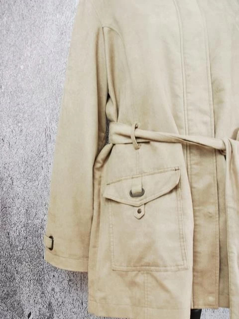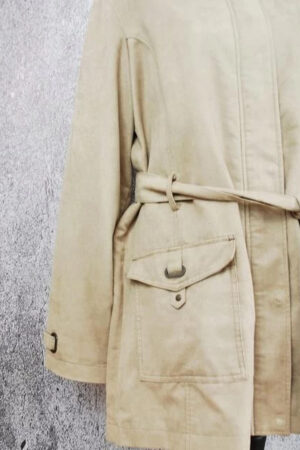Trench. Zamszowy. Zapinany na zamek. Pasek w talii. Dwie kieszenie z przodu.