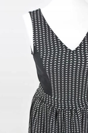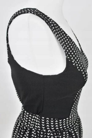 Rozkloszowana sukienka z wyszczuplającymi wstawkami. Dekolt w kształcie litery V. Drobny wzorek w serduszka.