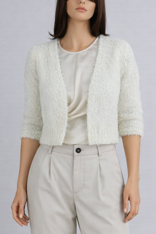 Stylowy, kremowy kardigan z delikatnymi cekinami to doskonały wybór na chłodniejsze wieczory. Wykonany z miękkiej dzianiny, oferuje komfort i elegancję w jednym. Krój z dłuższymi rękawami o trzech czwartych długości dodaje nowoczesnego charakteru, a otwarty przód nadaje lekkości. Idealnie komponuje się z casualowymi stylizacjami, dodając odrobinę blasku każdemu lookowi.