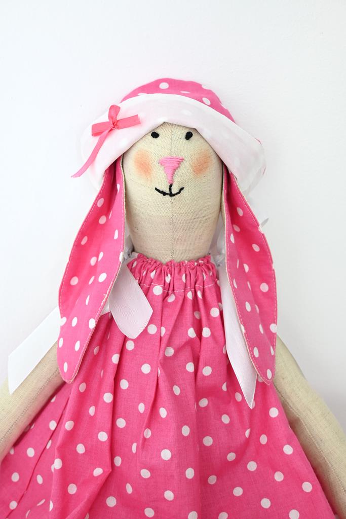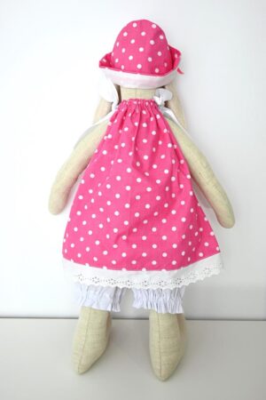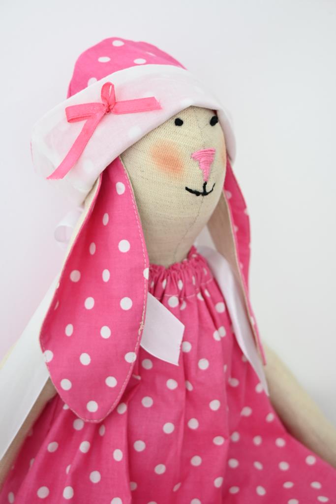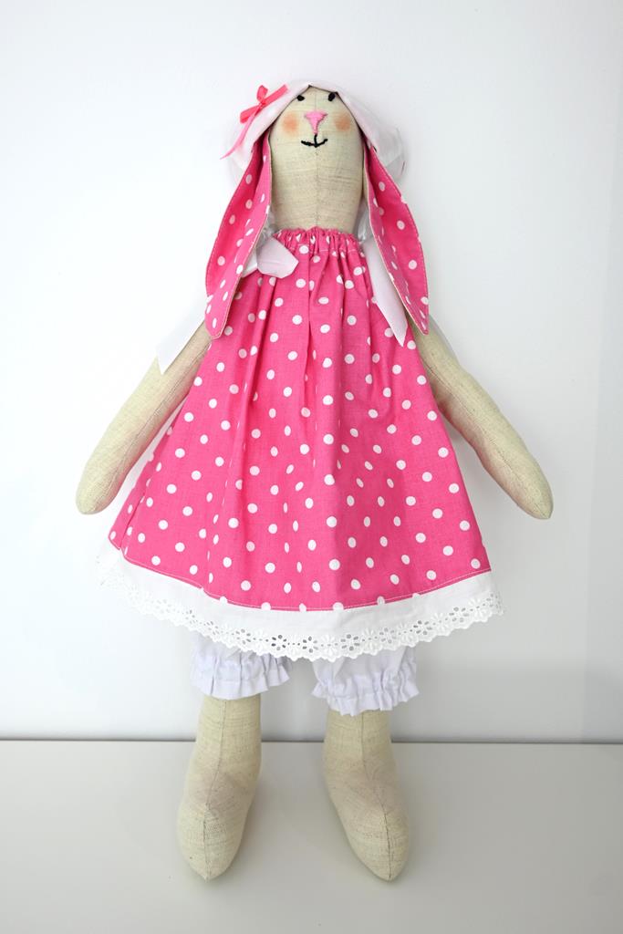 Maskotka zając w różowej sukience. Produkt handmade. Ubranie zajączki wykonane z materiałów z odzysku. Sukienkę i spodenki można zdejmować.